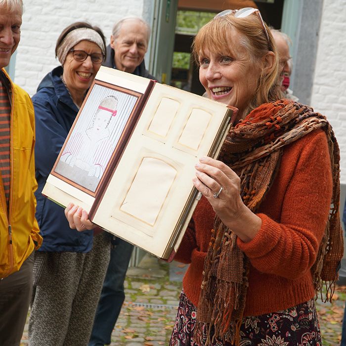 Le Musée Marthe Donas a proposé une initiative originale le week-end des 2 et 3 octobre : des balades théâtralisées en compagnie de la comédienne Véronique van Cutsem qui interprétait Marthe Donas pendant ses quatre séjours au château Bauthier, entre 1922 et 1947. Avec beaucoup de spontanéité et d’émotion, et en partant d’un texte inspiré des carnets de Marthe Donas, Véronique van Cutsem a transmis à quatre groupes et une septantaine de spectateurs les questionnements de Marthe sur l’évolution de sa peinture, son espoir de parvenir à un tableau qui se libérerait de la matière et ouvrirait sur un au-delà du visible, un tableau « parfaitement abstrait ». Marthe Donas a été une inlassable chercheuse de formes, de couleurs, qui voulait exprimer ses sentiments, ses intuitions, son tempérament par la peinture. Longtemps freinée par un père autoritaire qui lui interdisait de devenir artiste, puis par un milieu artistique masculin où on lui avait conseillé de cacher qu’elle était une femme peintre, et enfin par sa propre famille en situation de précarité dans les années 30 , elle a décidé à la fin de son dernier séjour à Ittre, en 1946-47, de se remettre à peindre, de reprendre sa quête de l’abstraction en peinture, et de signer enfin avec l’initiale de son prénom : M Donas.