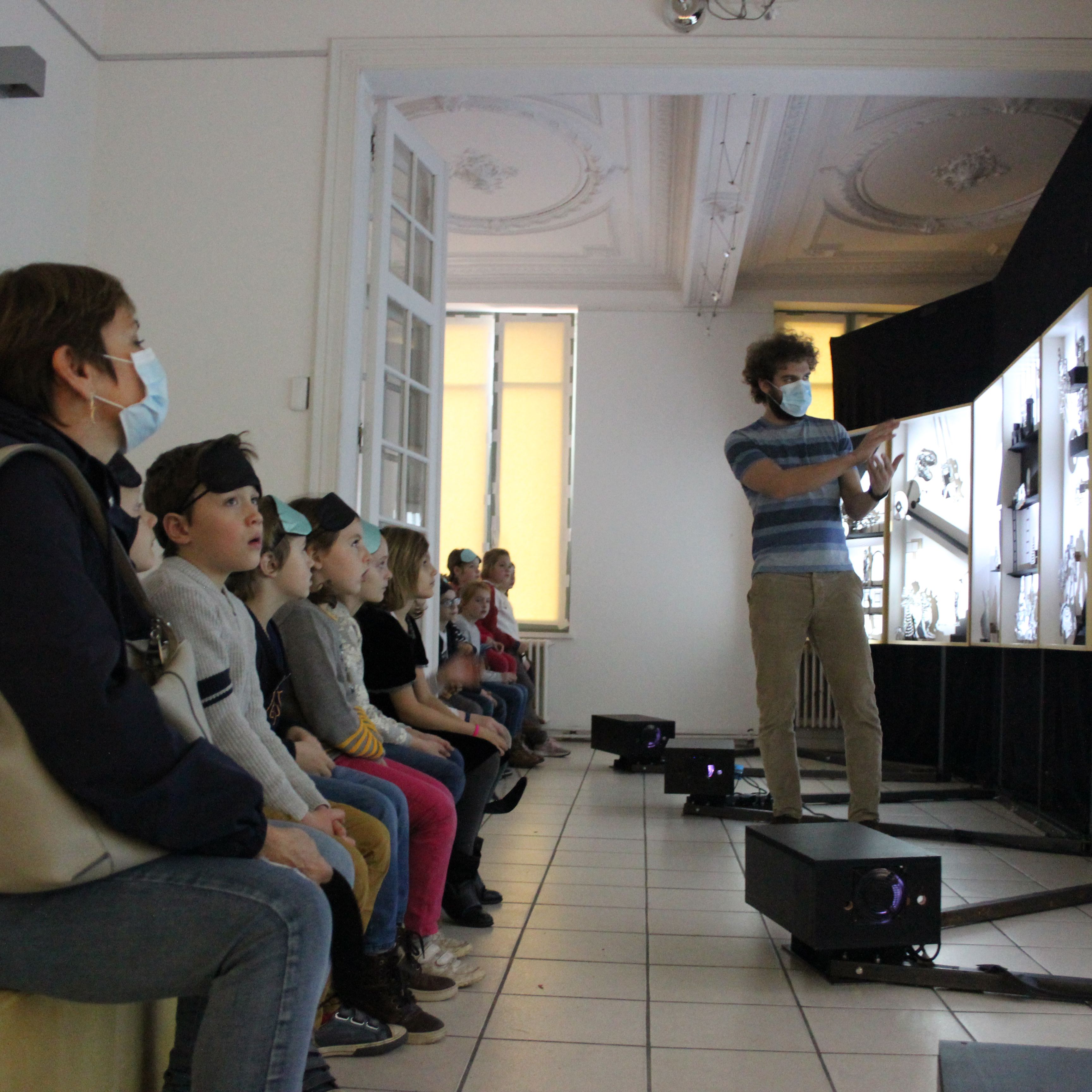 Découverte de l’univers foisonnant des deux artistes : les personnages de fiction, les jouets, les humains hybrides, les chiffres, les flèches, les éléments atmosphériques, les compositions de lumière grâce aux projections,…